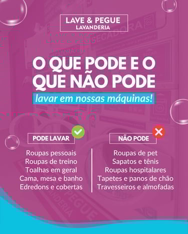 ❌ O que NÃO lavamos (Para proteger a sua saúde e as roupas do próximo cliente): Sapatos, tapetes, travesseiros, itens de pet, panos de chão, peças excessivamente sujas com graxa ou barro pesado e peças que ultrapassem a capacidade física da máquina (como grandes edredons). Manter um ambiente 100% livre de resíduos é o nosso compromisso inegociável com a sua roupa!