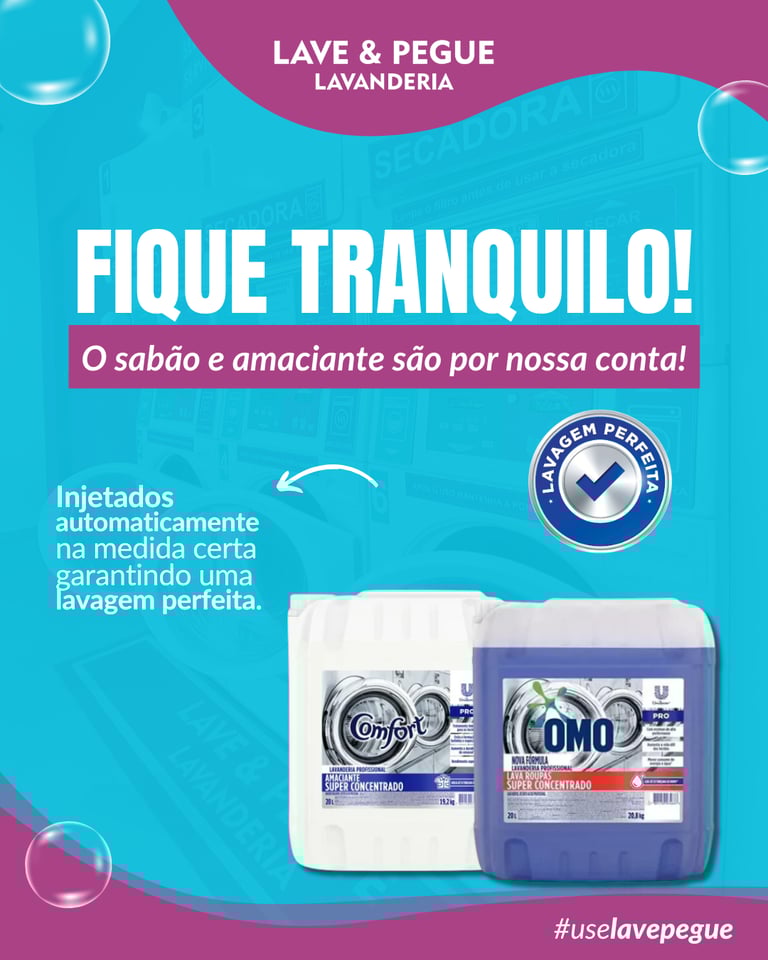 ✅ O que é perfeito para nossas máquinas: Roupas do dia a dia, camisas, calças, toalhas de banho, toalhas de mesa e lençóis. Tudo sai perfeitamente higienizado e cheiroso com a dosagem exata de OMO Profissional e Comfort Concentrado. Além disso, contamos com o maior cesto do mercado: você lava muito mais peças em um único ciclo, garantindo um custo-benefício imbatível com a máxima qualidade.